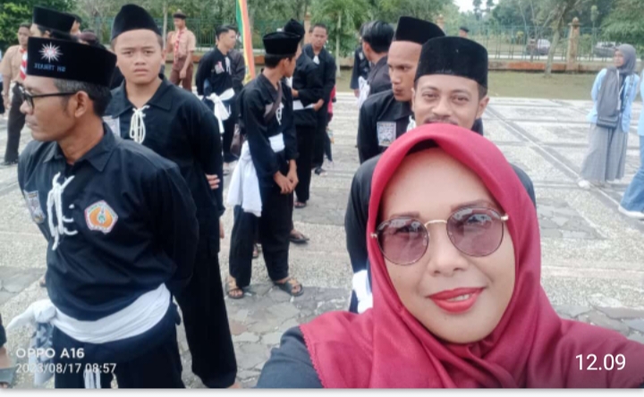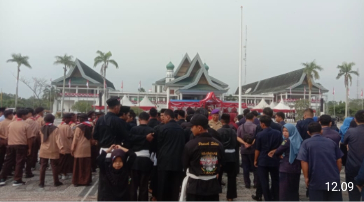 Siak- Puluhan Warga (anggota) Perguruan Persaudaraan Setia Hati Terate (PSHT) Cabang Siak Pusat Madiun ikut hadir sebagai peserta Pengibaran Bendera dalam rangka HUT Republik Indonesia ke 78 di Halaman Kantor Bupati Siak, Kamis (17/8/2023).